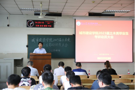 在12教202室举办2023届土木类毕业生考研动员大会,支持和引导学生继续考研深造、学成报国。学院副院长张继承、院党委副书记秦良斌,学工办主任周喆、专业教师代表黄德文,以及全体19级土木类学生参加会议。会议由院团委副书记何儒权主持。