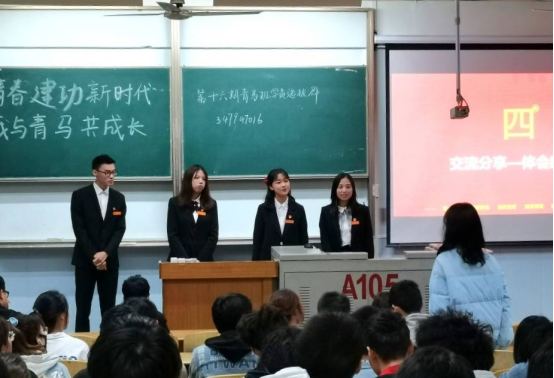 第十五期青马班学员杨晨晨、杨睿、尹东昊依次从思想上有信仰、学习上有进步、能力上有提高、同学中有威信这四个方面向大家介绍了青马班的意义和作用。杨晨晨说:“参加青马班让我在写作方面有了很大提升,甚至对于策划之类的事情现在也是得心应手”。“参加青马班让我有机会站上‘百生讲坛’主讲人的舞台,这对我来说是一段非常好的经历与回忆。”杨睿分享了她在青马班的成长感受。有着丰富竞赛经历的尹东昊说:“辉煌的背后一定蕴藏着别人难以想象的苦难,可既然选择了漫漫远方,便只有做那星光下的赶路人,日夜兼程。”