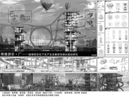 本次比赛时间历时3个月,参赛学生高伊娜、曾凌霄、罗浩丹、余炆劼利用暑假时间在指导老师徐齐帆老师和刘显成老师的指导下完成了参赛作品《降维游乐·厂——疫情常态化下生产生活兼容性增长路径研究》的设计,最终按时提交了参赛作品。