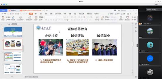 一、二年级以“诚信”为主题,一个不落的开展了主题教育班会,教育学生应学会做人、学会做事、学会认知。对于大学生,诚信问题更多的体现在学习生活方面,抄袭作业、考试作弊是大学生诚信缺失的典型表现,也有学生存在缴纳学费、办理助学贷款时恶意拖欠、弄虚作假等问题,对道德缺失所带来的后果还没有足够的认识。对于诚信,大学生应该要自我育化、自我反省,将所吸收到的学识转化为自觉地行动。