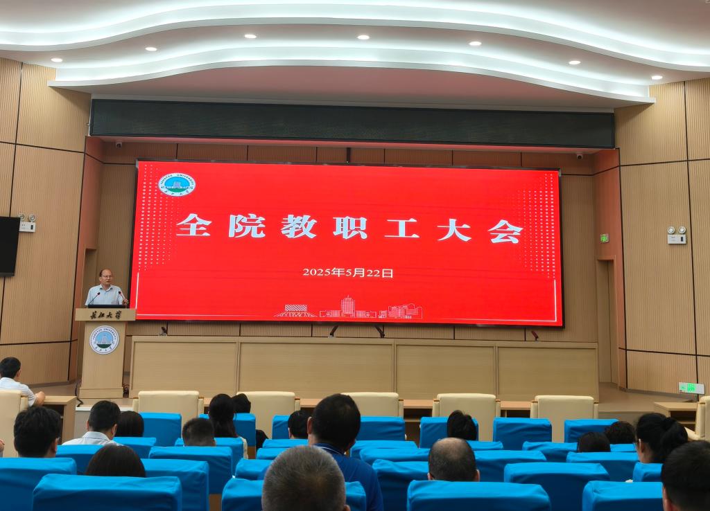 (通讯员 蔡威威)5月22日下午,学院在11教报告厅召开全院教职工大会,通报近期学院相关工作,并安排下一阶段重点任务。学院全体领导和教职工参加会议。会议由院党委书记谌姿主持。