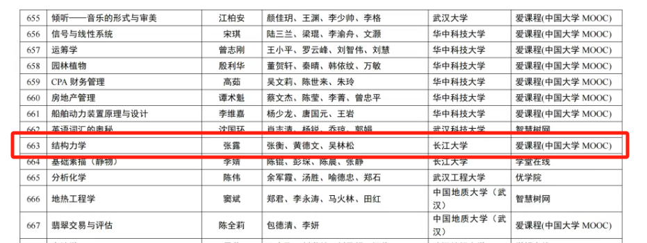 (通讯员 余韬)近日,教育部公示了第三批国家级一流本科课程认定结果,我院取得新突破!由张露老师担任课程负责人,张衡、黄德文、吴林松老师为团队成员的《结构力学》喜获线上一流本科课程认定。 截至目前,我院共获批1门国家级一流本科课程、7门省级一流本科课程,实现了线上课程、线下课程、混合式课程、虚拟仿真课程、社会实践课程五类“金课”的全覆盖,一流课程总数位居全校各学院前列。 课程是人才培养的核心要素,课程质量直接决定人才培养质量。学院一直以来高度重视课程建设,将课程建设作为提高人才培养质量的重要抓手,近年来,持续加大一流课程建设投入,不断完善课程建设管理、评价和激励机制,形成了“国家级、省级、校级”三级梯度一流课程建设体系,积极引导广大教师围绕教学内容、教学模式、教学方法等方面开展课程改革与创新。下一步,学院将进一步发挥一流课程的示范引领作用,持续推进课程改革,全面提升课程建设水平与人才培养质量。 (审核 朱国庆 编辑 杨洁晶)