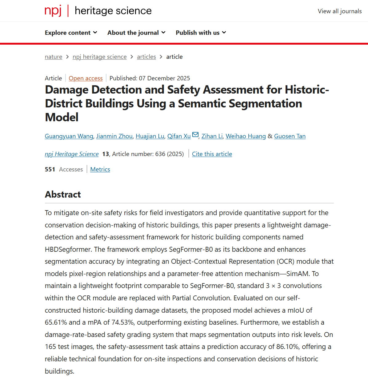 硕士研究生王广源在文化遗产国际顶级期刊《npj Heritage Science》发表题为“ Damage Detection and Safety Assessment for Historic-District Buildings Using a Semantic Segmentation Model ” 的论文。npj Heritage Science 前身为 Heritage Science(《遗产科学》),创刊于2013年,是文化遗产研究与保护领域具有重要国际影响力的英文学术期刊,为中科院一区top期刊,被A&HCI(Arts and Humanities Citation Index)和SCIE(Science Citation Index Expanded)收录。自2025年1月1日起,npj Heritage Science正式加入Nature系列期刊。