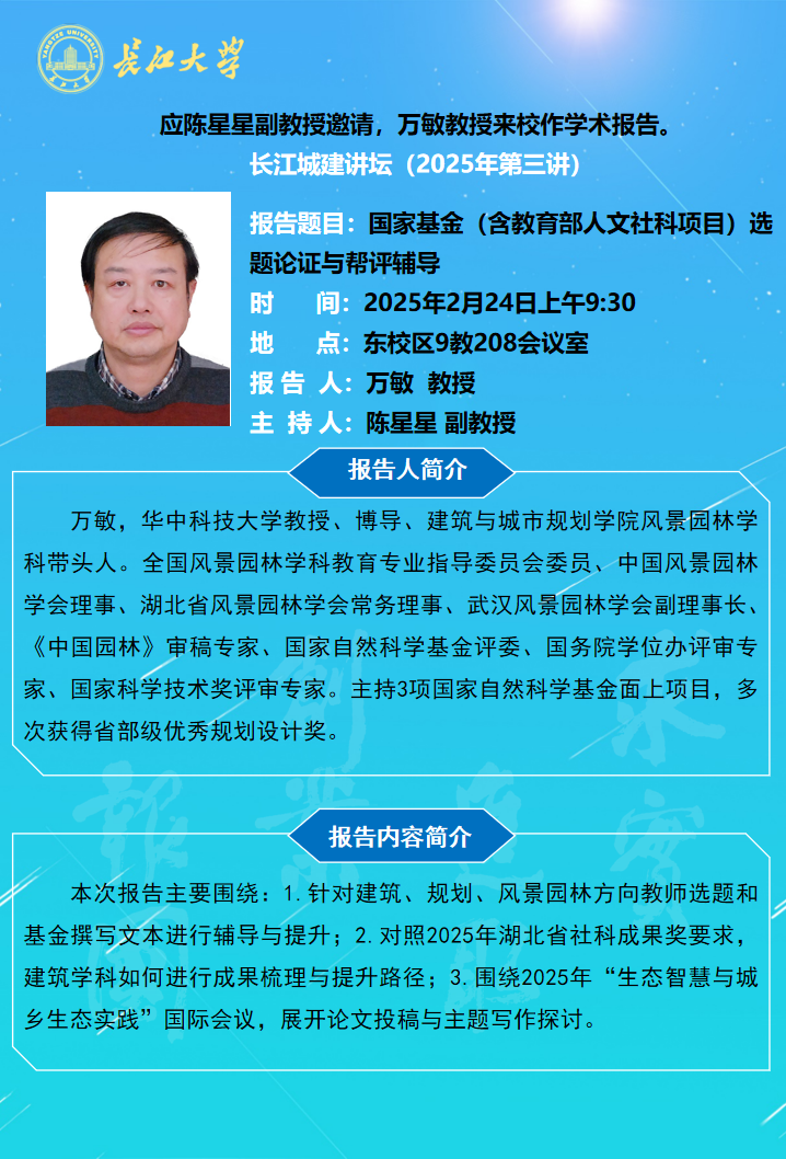 长江城建讲坛2025年第三讲:国家基金(含教育部人文社科项目)选题论证与帮评辅导