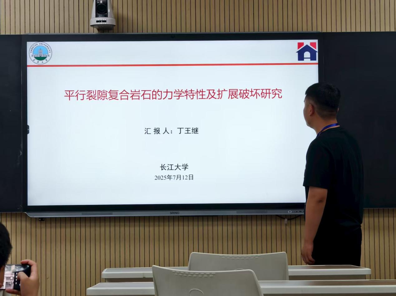 2024级研究生丁王继在论坛中以“平行裂隙复合岩石的力学特性及扩展破坏研究”为题进行汇报,汇报主要内容是探究裂隙复合岩体力学特性及破坏机制,采用相似材料制备含不同位置与倾角平行裂隙的砂岩-灰岩复合岩样,开展单轴压缩试验,结合数字图像相关(DIC)与声发射技术,研究裂隙分布对力学特性、裂纹扩展及损伤演化的作用机制。