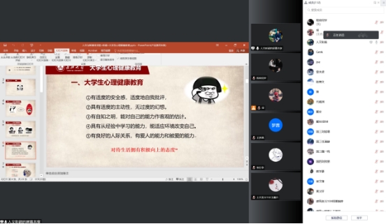 彭超老师运用诙谐有趣的表情包融入PPT,用明快的演讲方式,提升了同学们的积极性,向同学们讲解了大学生心理安全教育的重要性,提醒我们关注心理健康,最后向同学们介绍了学校心理健康教育中心。