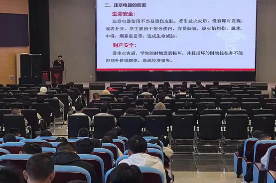 郭俊老师从食品安全,宿舍安全,宿舍人际关系与交通安全四个方面讲解,他着重提到要注意食品安全,提醒同学们不购买三无产品,不在宿舍使用违规电器。他讲解了遇到突发状况如食物中毒、突发火灾等问题时的相关急救与安全逃生措施。他还强调了宿舍人际关系的重要性并劝导同学们要和谐相处。最后,他提醒同学们要遵守交通规则,提高了同学们的交通安全意识。