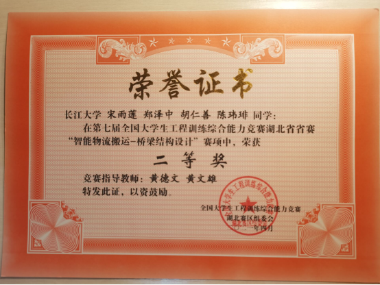 宋雨莲:第七届全国大学生工程训练综合能力竞赛湖北省省赛“智能物流搬运-桥梁结构设计”二等奖