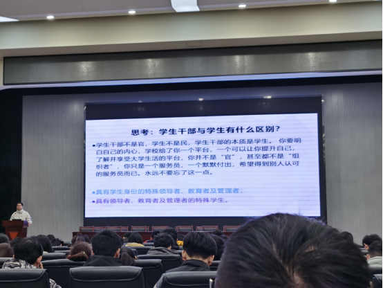 培训的第四节课上,机械学院的向如老师以《学生干部应具备的能力和素养》为题,就学生干部应具备的能力和素养两个方面进行了一系列讲述,明确了学生干部应具备的四大素质和四大意识。同时引用习近平“正人先正己”的观点,为学生干部提高自我的重要性。