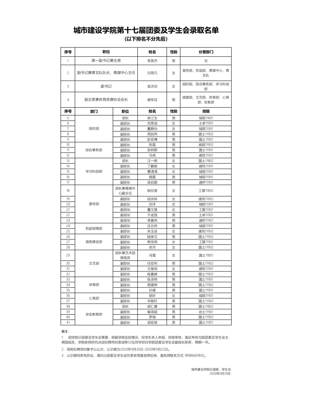 各位城建师生,大家上午好: 经学生本人申报、资格审查、面试考核与院团委学生会各部门部长、主席团成员、学院老师研究决定,财神娱乐场 第十七届团委及学生会(东区)招新结果已出,详情公示如下: