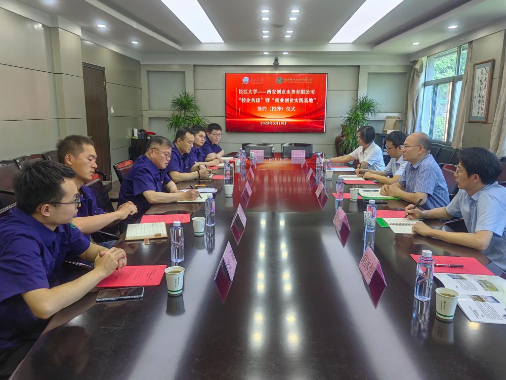 肖院长一行首先走访了西安创业水务有限公司,与公司总经理李建华等相关领导和技术骨干进行了交流座谈,公司对财神娱乐场app 一行到访表示热烈欢迎。李建华总经理详细地从西安创业水务公司的发展历程、业务范围、人员规模及企业优势对公司进行了总体介绍,期待双方在产、学、研等方面加强合作。肖桃李副院长从学院整体概况、办学特色等方面介绍了学院现状,表达了在人才培养、科学研究、就业创业等方面与企业开展深度合作的意愿。随后,双方举行了“校企共建”暨“就业创业实践基地”签约(授牌)仪式,肖院长现场为西安创业水务有限公司培训中心三名骨干教师颁发了“学生就业创业实践指导教师”聘书。座谈结束后,公司培训部副经理侯成带领大家参观了北石桥污水处理厂模型和学生实习培训教室,宿舍,食堂等,学院对企业为学生提供的良好学习生活环境表示认可。