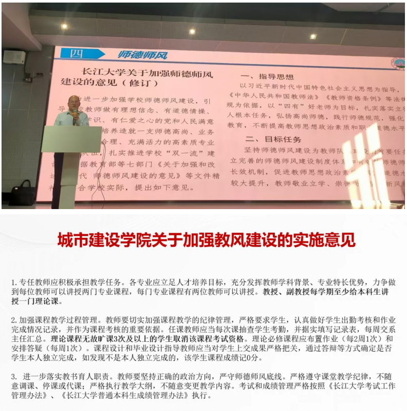 学院始终坚持以习近平新时代中国特色社会主义思想为指导,将习近平总书记关于“教育是强国建设、民族复兴之基”“要培养造就新时代高水平教师队伍”等重要论述和指示批示精神作为重点学习内容,将师德师风教育贯穿到全院教职工大会、支部主题党日活动、党委理论学习中心组等学习的过程中,让广大教师牢记立德树人根本任务,担当为党育人、为国育才使命责任。11月11日,在全院教职工大会上,院长肖桃李结合“长江大学关于加强师德师风建设的意见(修订)”,要求全体教师要弘扬高尚师德,践行师德规范;副院长黄向阳结合学院实际,向老师们详细解读学院“关于加强教风建设的实施意见”。